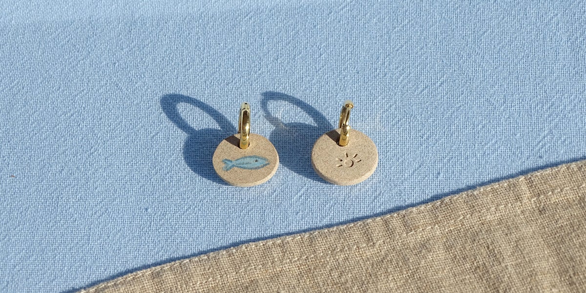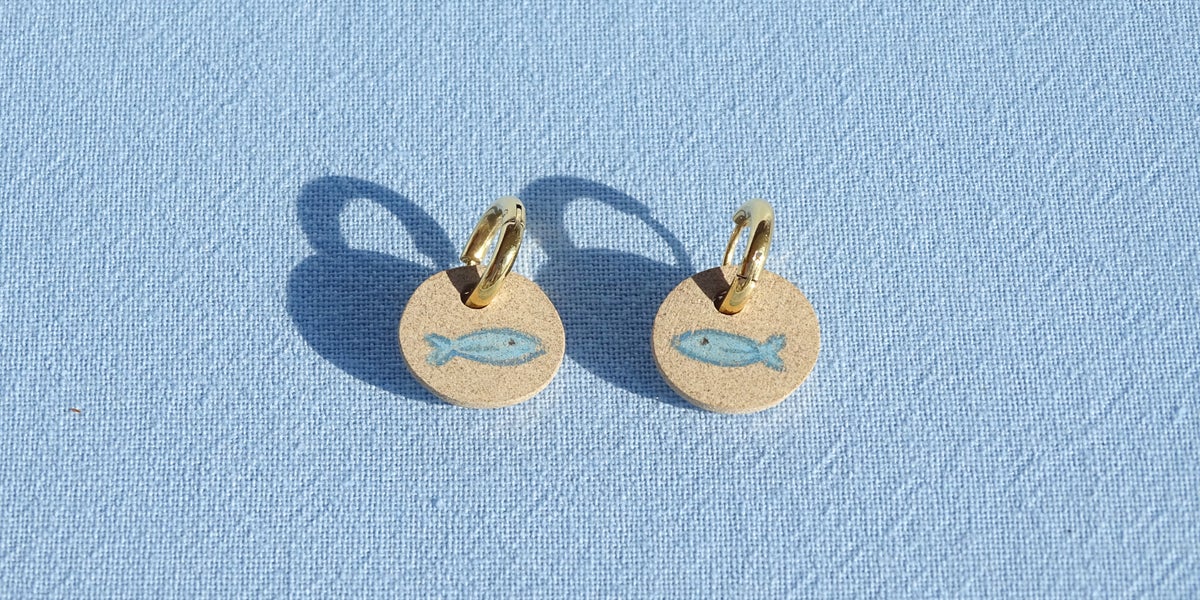 These stoneware earrings are handmade from a beautiful brown clay bodie. Each fish is drawn by hand using a glaze pencil, giving the appearance of a pencil sketch, but it's actually glaze that will never fade.